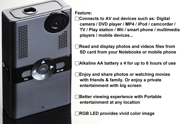 Composite AV/ mini USB/ SD card slot/ built-in 1GB memory |